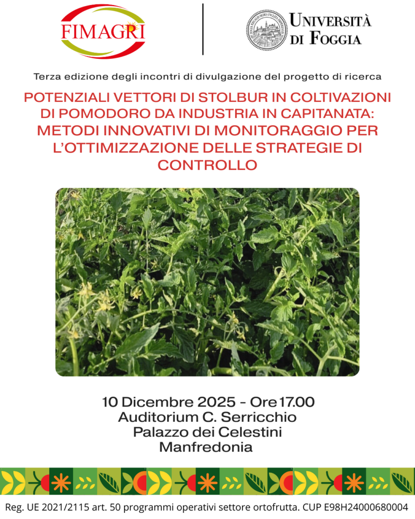Si è tenuta, presso l’Auditorium C. Serricchio di Palazzo Celestini, la terza edizione degli incontri divulgativi del progetto “Studio sui potenziali vettori di Stolbur in coltivazione del pomodoro da industria in Capitanata: metodi innovativi di monitoraggio per l’ottimizzazione delle strategie di controllo” nell’ambito del Programma Operativo – Settore Ortofrutta Reg. EU 2115/2021 art. 50 2023-2029, annualità 2025.